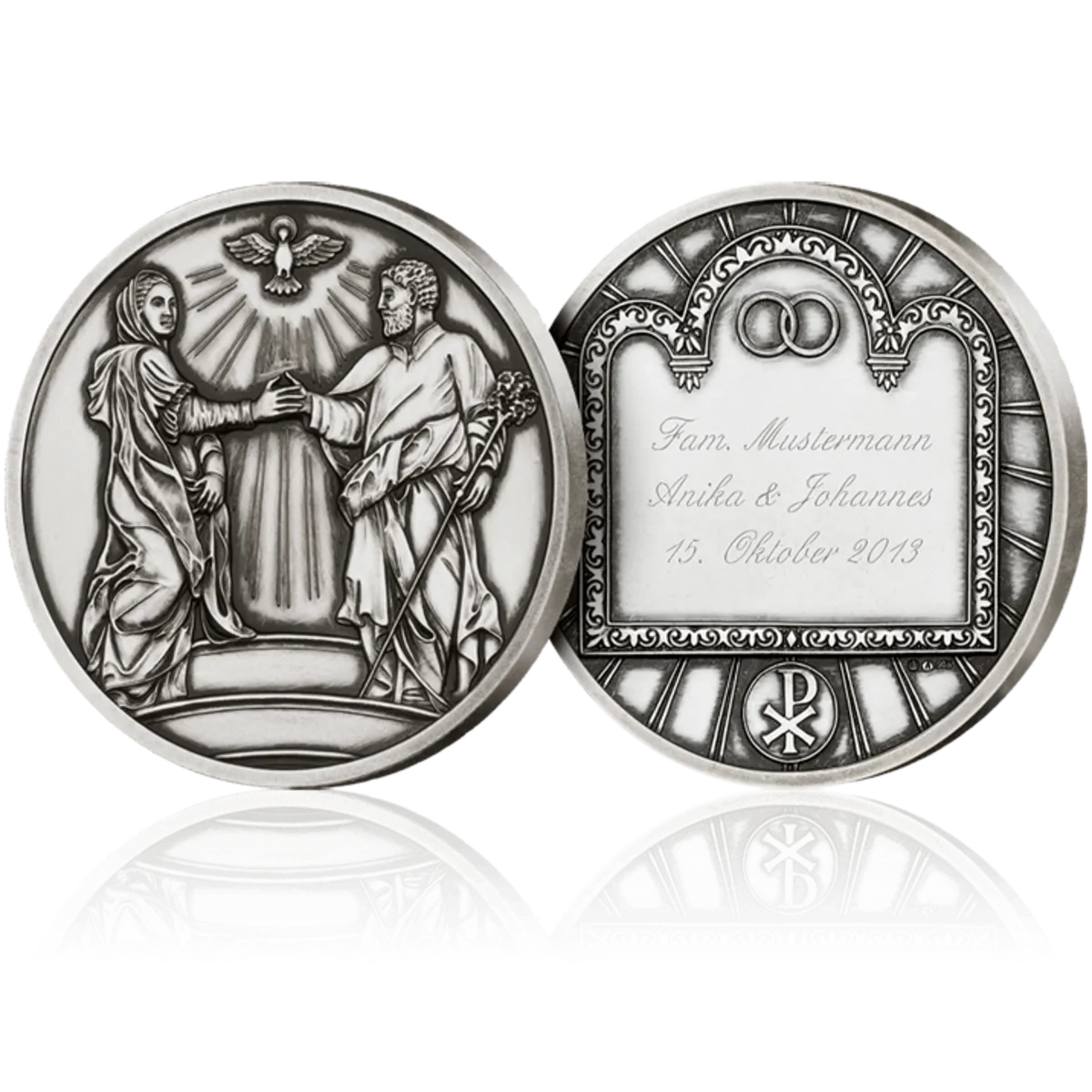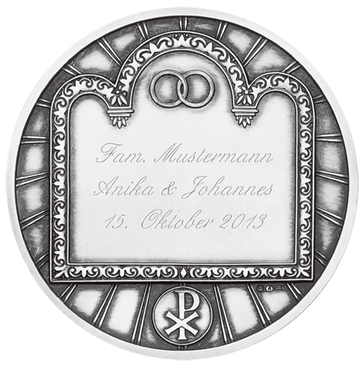 Very personal and individual is an engraved occasion medal with the names of the couple and their wedding date. Choose between the classic and the historical wedding medal from the Wachgeküsst collection and simply enter the desired dedication in the fields in the shopping cart.