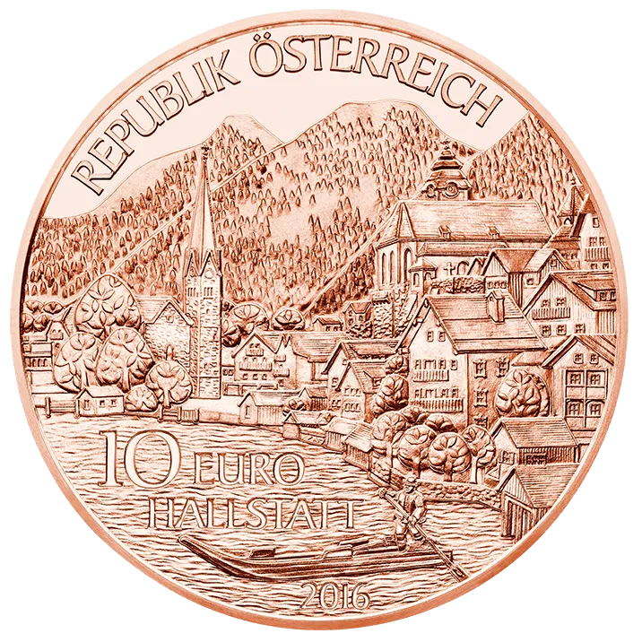 Located in the central-northern part of Austria, bordering Germany and the Czech Republic, Oberösterreich is the country’s fourth-largest province by area and the third by population. The church on Pöstlinberg Hill in Linz, the provincial capital, features on the coin’s reverse, along with Mount Traunstein and Lake Traunsee, in a design by Klara Baumgartner from Dachseberg high school. Her design also features the legendary Glöcklerlauf, a traditional race in which the participants wear spectacular headdresses that light up the dark winter evening of the 5th of January every year, and was deemed Intangible Cultural Heritage by UNESCO in 2010. The picture-postcard town lakeside town of Hallstatt, which graces the coin’s obverse, is also part of a UNESCO World Heritage site