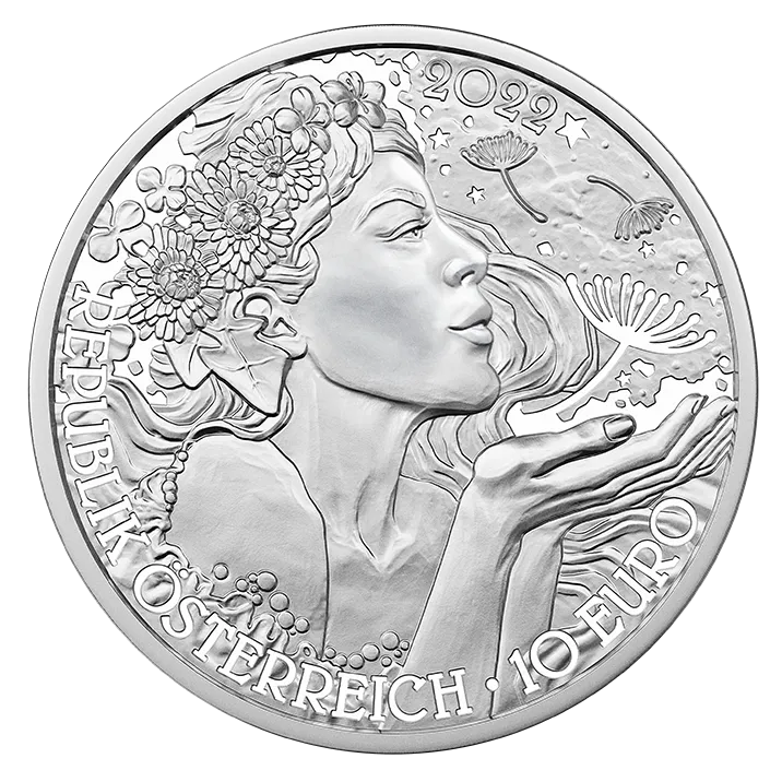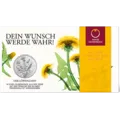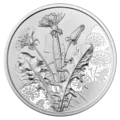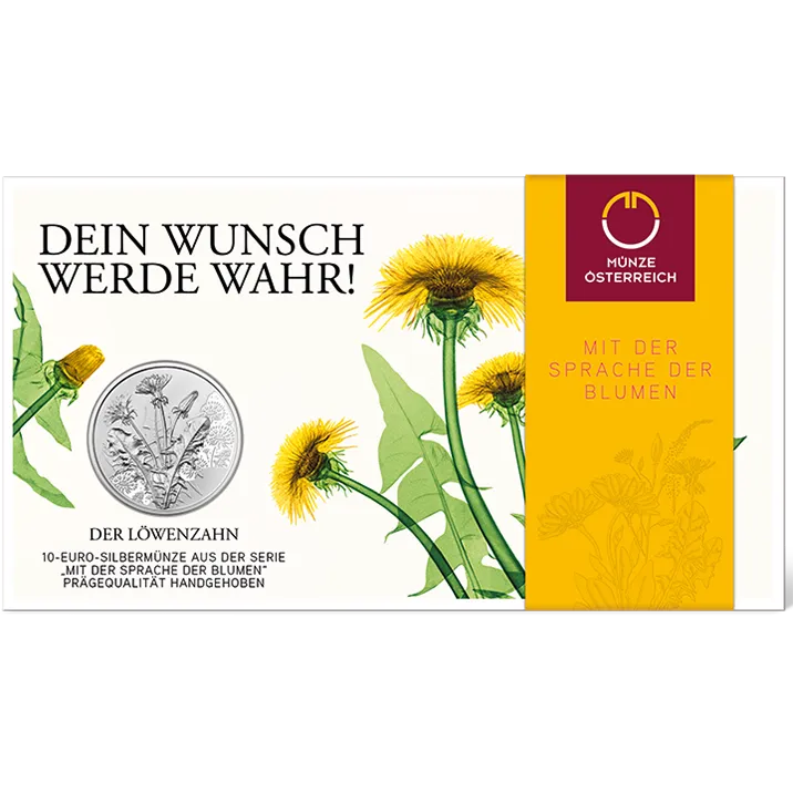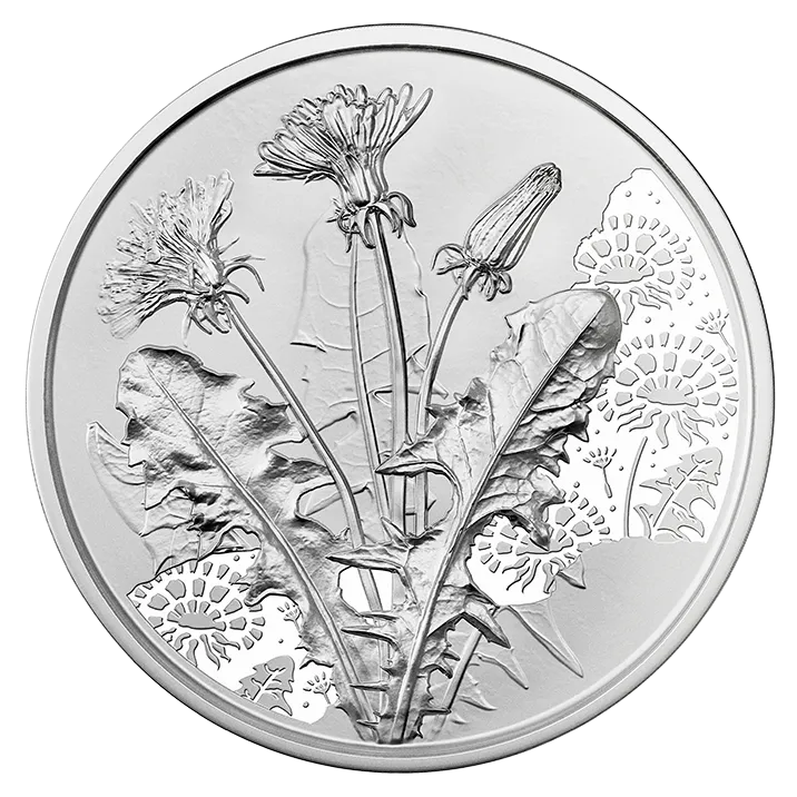 The dandelion’s golden-yellow flower, serrated leaves and spherical puff of seeds make it instantly recognisable. Unlike most other plants, the dandelion accounts for numerous myths and superstitions that are specifically related to its seed head. Some say that wishes made while blowing off the plant’s seeds will be granted, others that you can send a message to a loved one by concentrating on what you would like to convey while blowing the seeds in their direction. It therefore comes as no surprise that the dandelion represents ‘a wish come true’ in the language of flowers. This idea is beautifully illustrated on the coin’s obverse in the shape of a young woman with flowers in her hair blowing dandelion seeds. Next to an ornamental side image of a dandelion, which is stylishly printed in colour, the coin’s reverse features an imprint of a real dandelion with open and closed flowers.