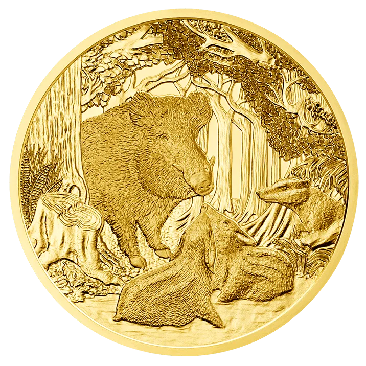 Not for nothing is the wild boar the world’s most widely extended species of cloven-hoofed animals. A predecessor of the domestic pig, it is a strong, adaptable and highly intelligent omnivore. The second in our handsome Wildlife in our Sights series, this brilliant gold coin may be a real eye catcher, but in real life the wild boar doesn’t like to draw so much attention to itself, sleeping in the day and foraging for food at night.