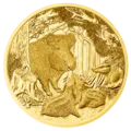 This is a wise strategy considering that wild boar have been hunted for centuries. When cornered or protecting their young they can be very dangerous adversaries, which is clear from the impressive male shown in profile, tusks clearly visible, on the coin’s obverse. The coin’s reverse shows a female, or sow, watching over her young offspring as they wallow playfully in mud. A badger looks on in the woodland habitat both animals share, which, as shown on both sides of the coin, preferably contains oak trees since they provide acorns in abundance. The wild boar may be a flexitarian, but even omnivores have a favourite dish.