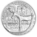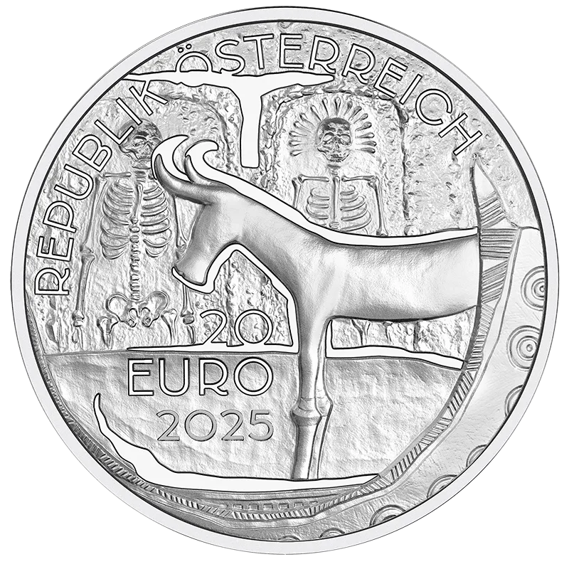 A bowl decorated with a bull is shown in the foreground of the coin’s obverse, one of the remarkable artefacts unearthed at the burial grounds of Hallstatt, which are symbolised in the background by a pair of skeletons. Inspired by artistic depictions found on bronze vessels from the Iron Age, known as situlae, the coin’s reverse features an image of a ritual in the foreground, in which a prostrate person is being blessed or anointed by another who is standing. In the background, beyond those supporting the ritual and a blazing fire, a water bird is depicted. Due to its great importance, salt also played a part in rituals. Valuable things were sacrificed, among them ‘white gold’.