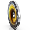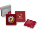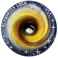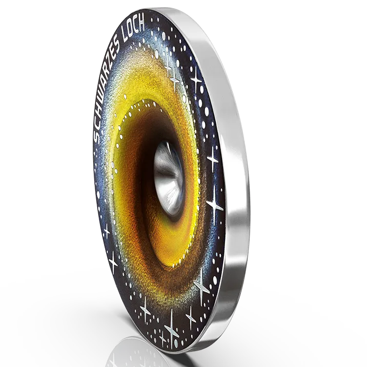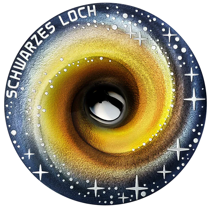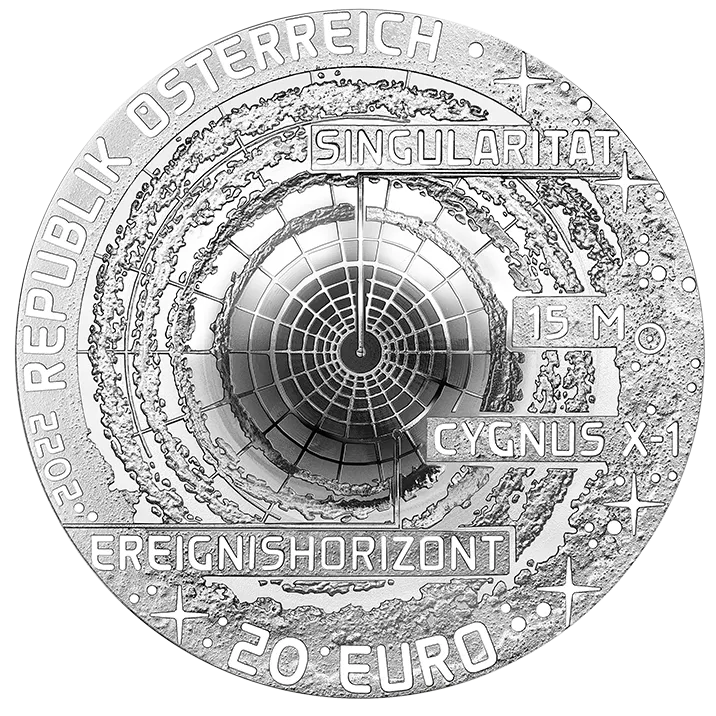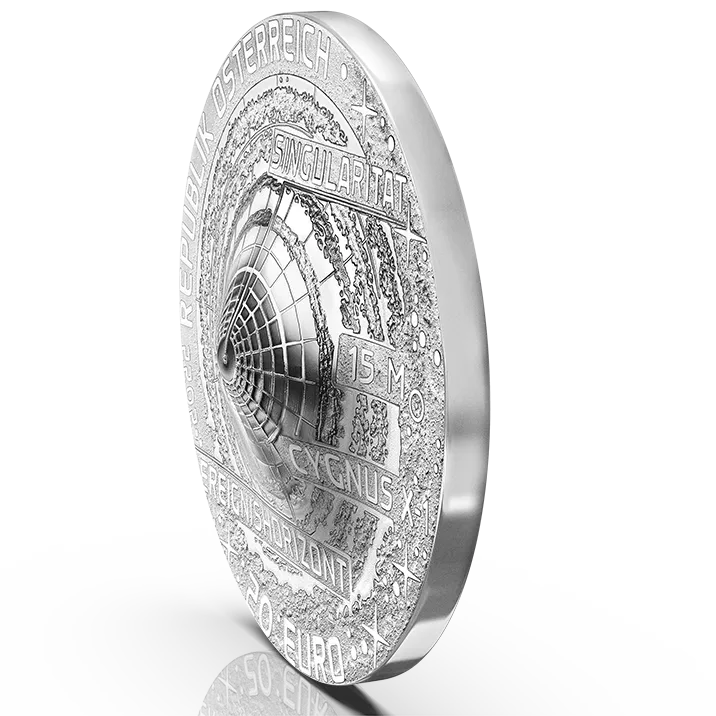 The black hole vortex phenomenon is illustrated on the coin’s reverse in the shape a funnel decorated with a colour-printed spiral. On the coin’s obverse, a cone rises from the flat silver surface, representing the curvature of space-time. ‘Cygnus X-1’, the name of the first black hole to be named as such, is written to the right under ‘15 M☉’, the solar mass of this black hole. In German, ‘Event horizon’ marks the boundary between the observable and the unobservable in space-time, while ‘Singularity’ points to the location of maximum space-time curvature.