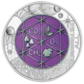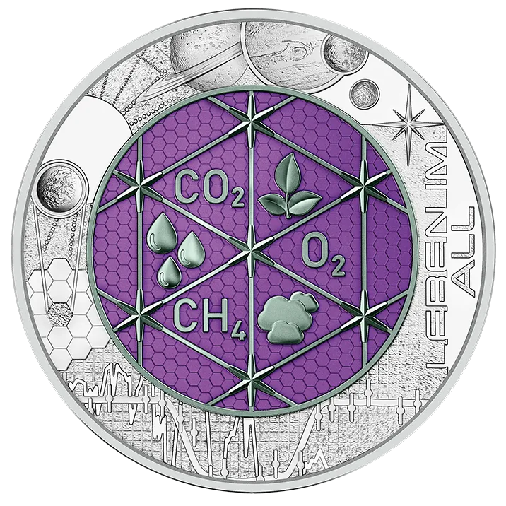In the niobium core of the coin’s reverse, some of the factors that could favour life on other planets are represented: carbon dioxide, methane, oxygen, vegetation and water. In the outer silver ring, the Webb is shown capturing an exoplanet passing in front of a star.