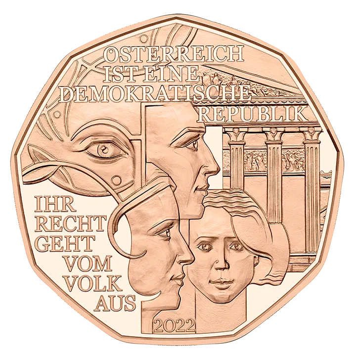 The coin’s reverse features two heads in profile and one full face, which represent the people as sovereign. To the left, we see a watchful eye surrounded by stylised laurel leaves, to the right, we see a section of the Austrian Parliament building in the background. But much more than this, the coin illustrates the spirit from which our nation was born. This is reflected in the Austrian Constitution, where it says: "Austria is a democratic republic. Its law emanates from the people." These wise words appear on the top and bottom edges of the coin.