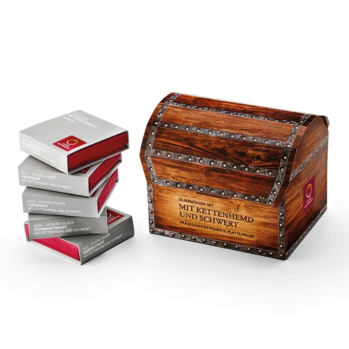 Binnenin vind je de zilveren munten "Chivalry", "Adventure", "Valour", "Fortitude" en "Brotherhood" samen met de bijbehorende certificaten.
