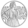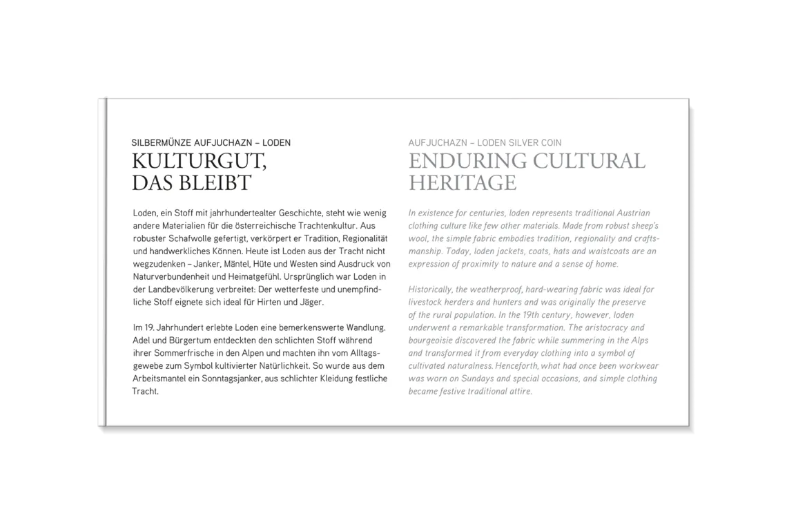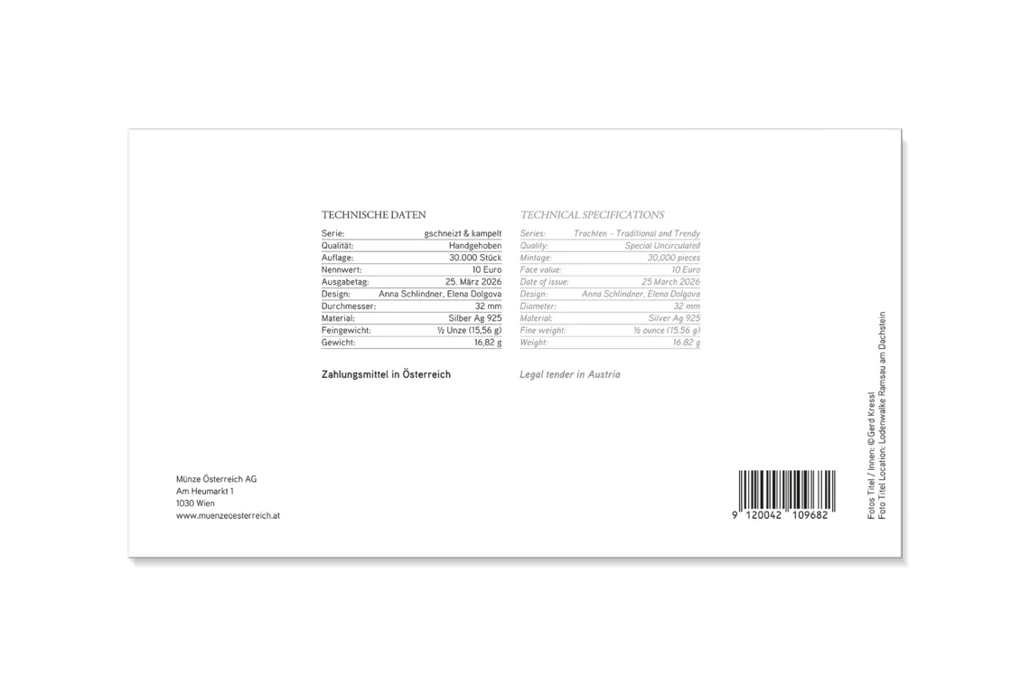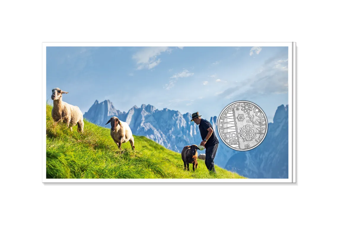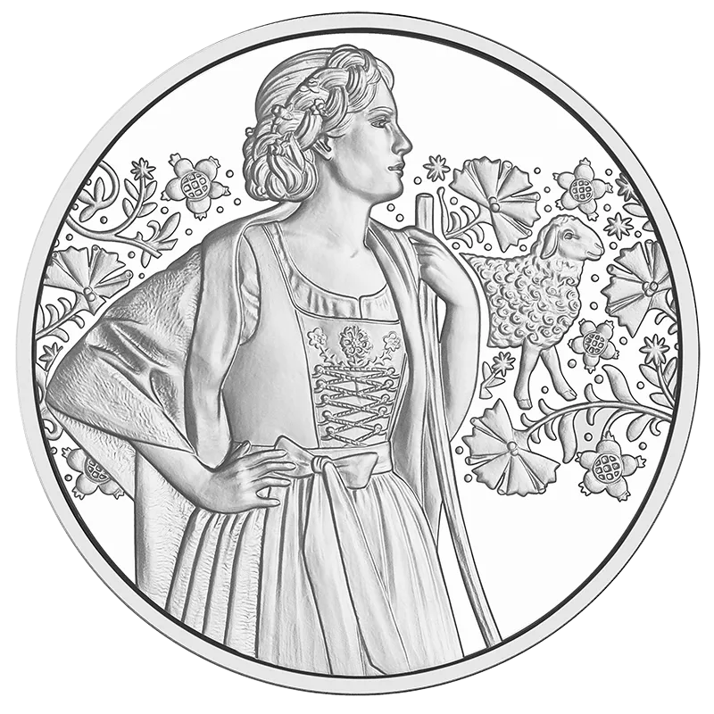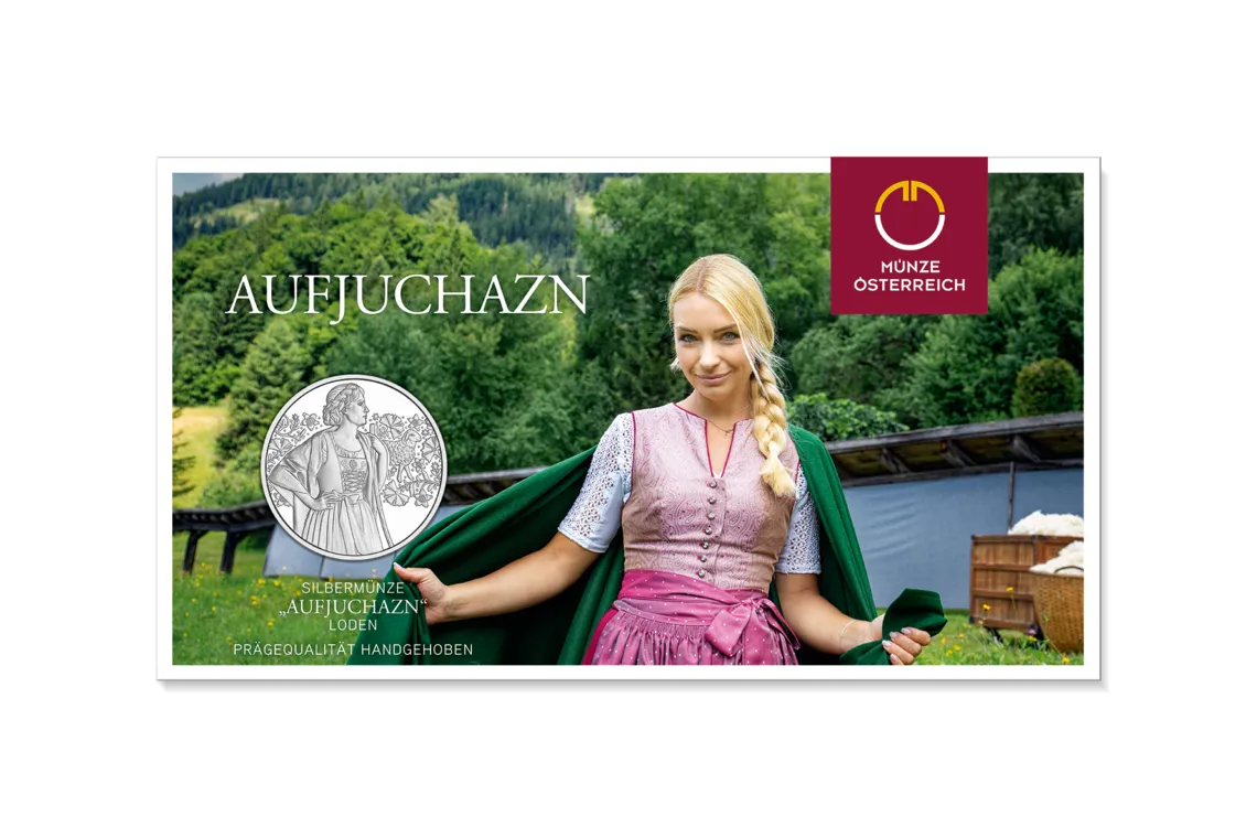 De munt toont een vrouw in traditionele klederdracht, wier dirndl-jurk wordt benadrukt door een uitvoerig geborduurd lijfje en fijne vetersluiting. Om haar schouders zit een loden sjaal, die haar niet alleen warm houdt maar ook de traditionele esthetiek benadrukt. Op de achtergrond doet een ornament in de stijl van het geborduurde lijfje denken aan de artistieke versieringen die elk traditioneel kostuum uniek maken. Het gestileerde schaap in het ornament verwijst naar de bron van deze fijne stof - schapenwol.
