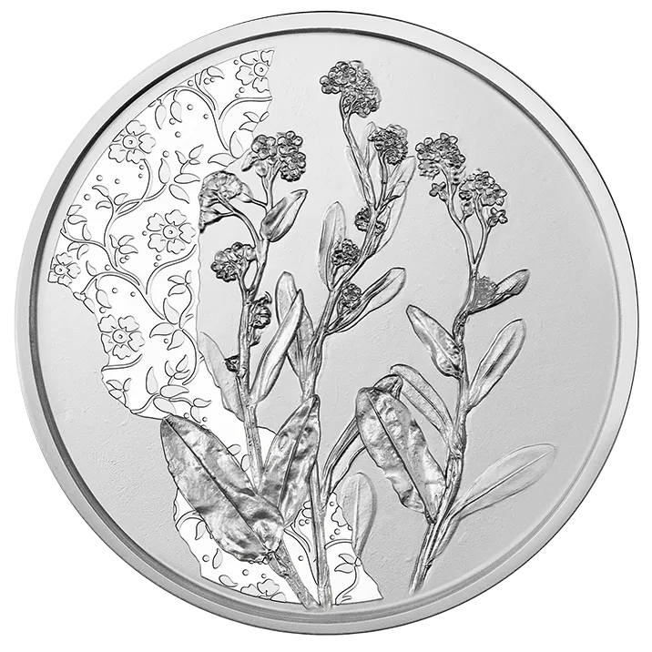 "Het vergeet-mij-nietje is de vierde munt in de serie Met de taal van bloemen. Kies tussen de zilveren munt met of zonder kleurenprint en de koperen munt.