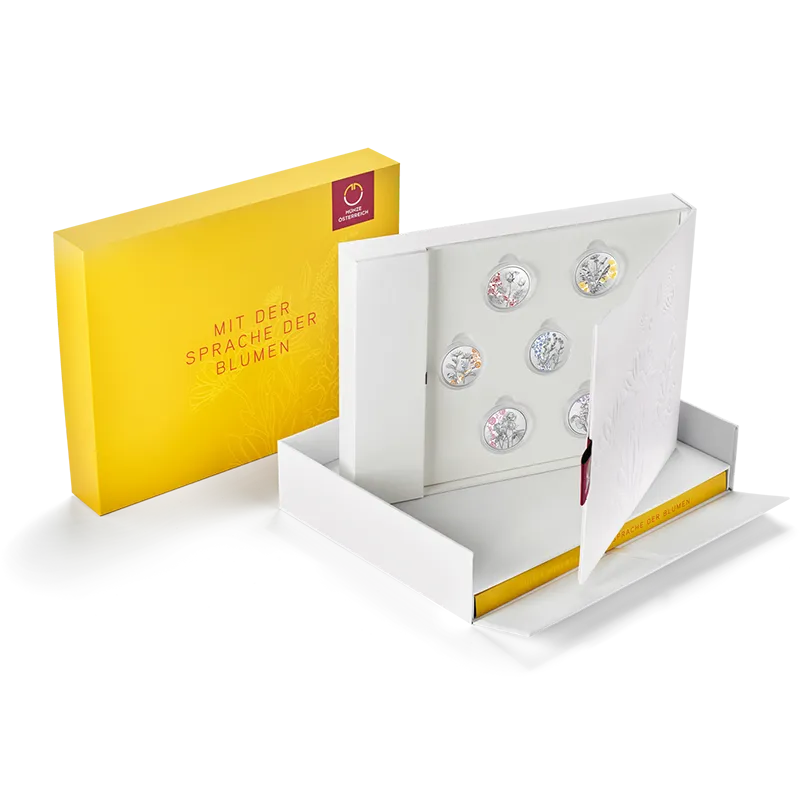 De originele verzameldoos van de serie bevat alle zeven bloemenmunten in zilver PP, evenals het boek over de serie "mit der Sprache der Blumen" in het Duits: