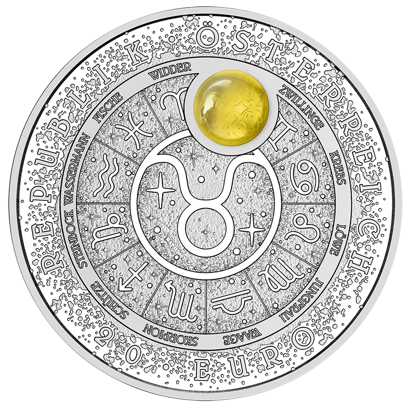 De waardezijde toont de dierenriem met de symbolen van alle twaalf sterrenbeelden. Het symbool van Stier is naar het midden verplaatst; op zijn plaats aan de rand van de cirkel en als het ware als zijn supporter, schittert een gele barnsteen. De gladde, ronde vorm straalt een rustgevende kalmte uit. Een sterrenhemel vormt de achtergrond.