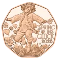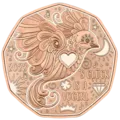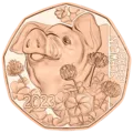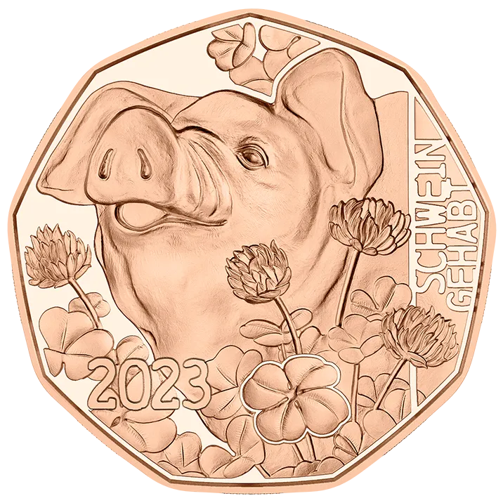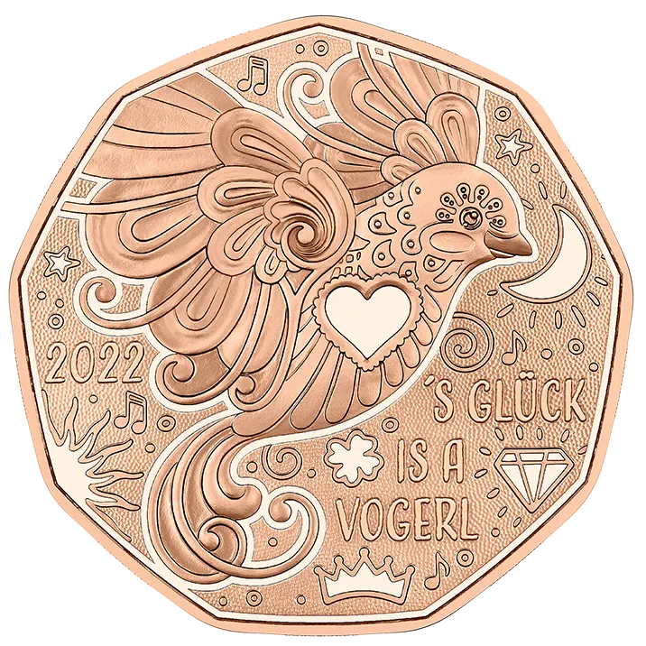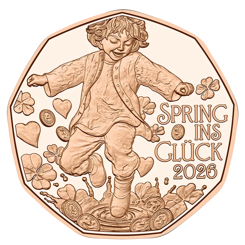 Deze geluksmuntenset bevat zeven koperen nieuwjaarsmunten met de thema's joie de vivre, Janus, 's Glück ist ein Vogerl, Schwein gehabt, 365 +1 Tag Glück, Tanz dich frei en Spring ins Glück.