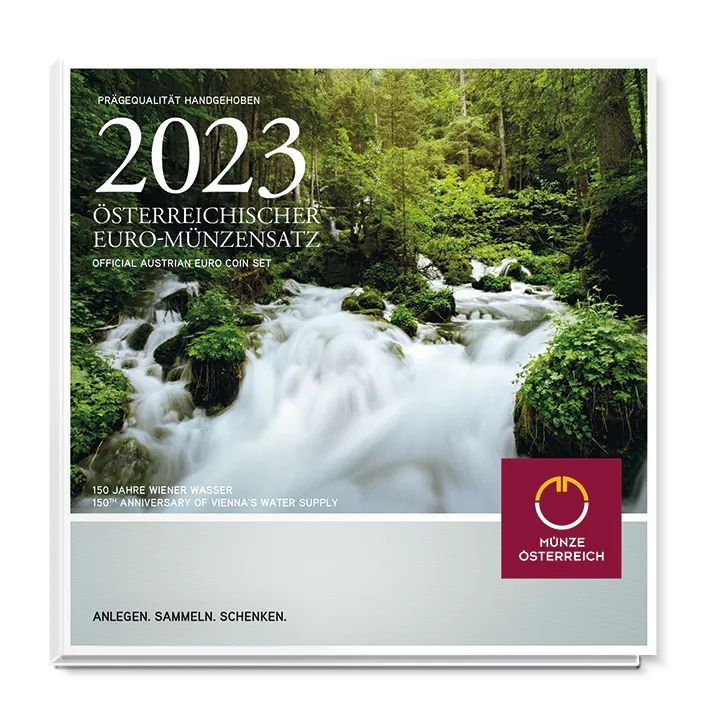 De officiële Oostenrijkse euromuntset 2023 viert de 150e verjaardag van de ingebruikname van de Eerste Weense Bronwaterleiding, die de Oostenrijkse hoofdstad van drinkwater voorziet.