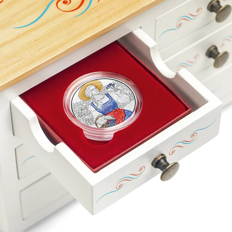 Passend bij de nieuwe muntserie "gschneizt & kampelt" bieden wij u een exclusief verzamelsysteem: een elegante houten cassette die is ontworpen in de stijl van een boerenladenkast. Het combineert traditie en vakmanschap op een elegante manier en weerspiegelt het thema van de muntserie: traditionele klederdracht.