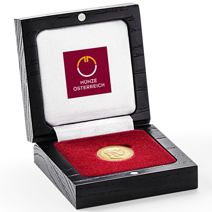 Goed opgeborgen voor de toekomst: de perfecte kist voor je gouden munten. In het doosje passen de enkele dukaat, het 4 guldenstuk en een gouden munt van 10 kronen. Perfect om je schatten in te bewaren of om cadeau te geven.