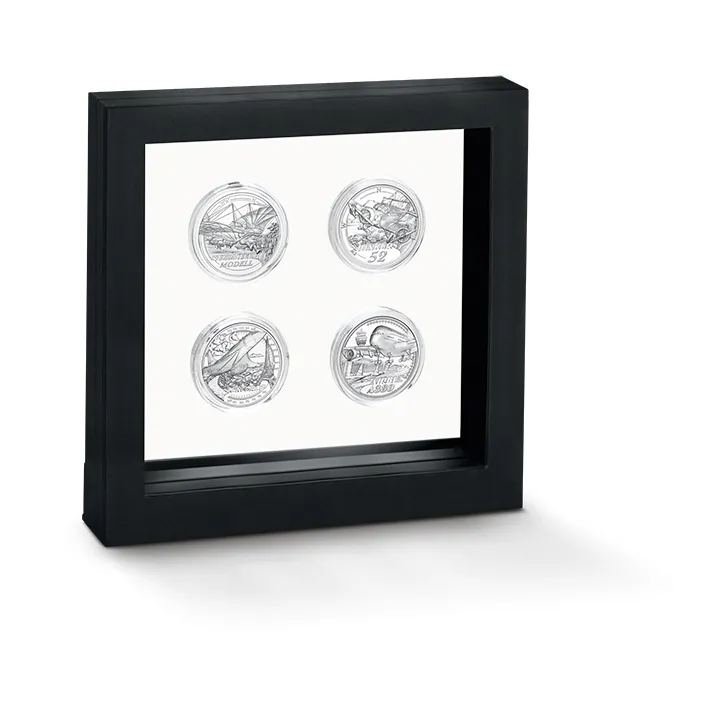 Laat uw munten perfect uitkomen in deze prachtige lijst. Ingesloten door twee transparante siliconenmembranen lijken de munten te zweven. Beide kanten van de munten kunnen op elk moment worden bekeken, omdat het frame vrij kan worden geplaatst. Het flexibele materiaal past zich aan elke muntvorm aan en houdt de munt stevig op zijn plaats. Het frame kan gemakkelijk worden geopend en weer gesloten met behulp van een magnetische sluiting.