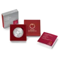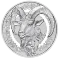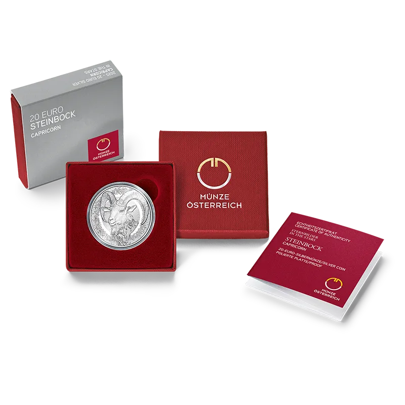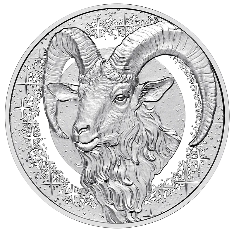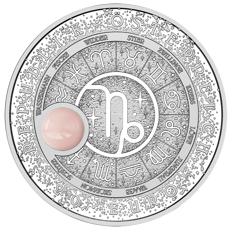 The obverse of Capricorn features a ring naming all 12 signs of the zodiac and their symbols. The symbol for Capricorn adorns the centre in large letters. At the edge of the circle, a pink rose quartz, which stands for the constellation Capricorn, shines in all its beauty. Round and smoothly cut, it gets its shine from the natural structure of the stone. An ibex with imposing curved horns forms the centre of the coin’s reverse. It is framed by a circle that dissolves into stars towards the edge of the coin. A starry sky is depicted behind the ibex.