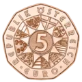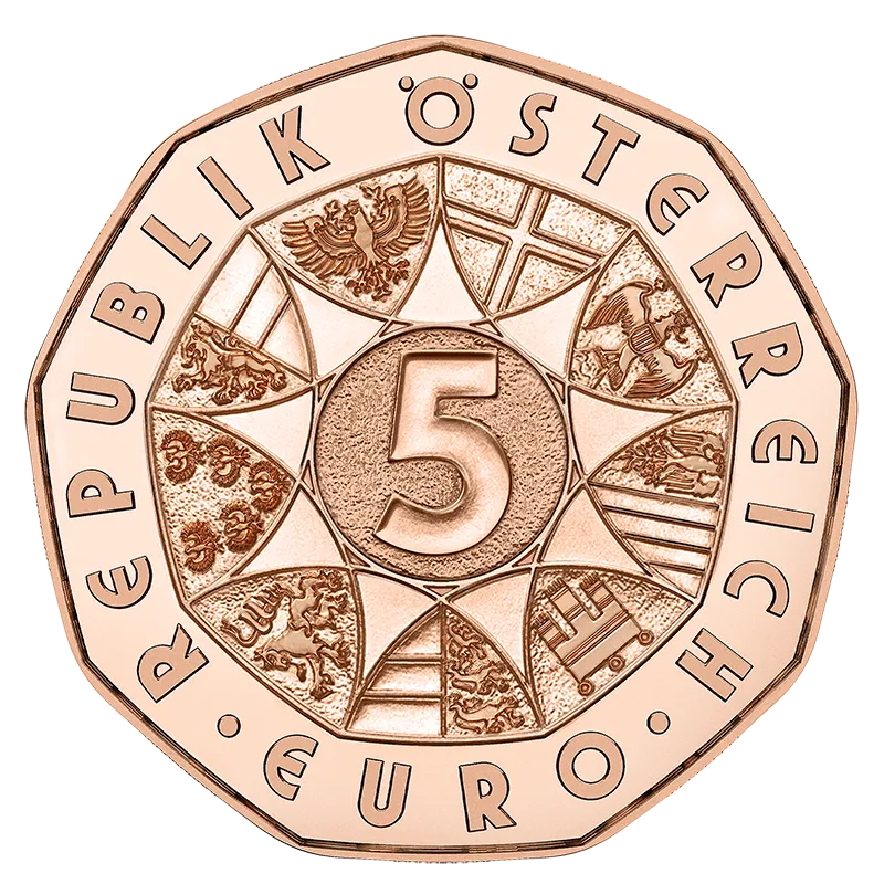 The Narcissus coin’s reverse features four narcissi in bloom, representing the three species of the flower that are native to Austria. Depicted on the left is the star shaped narcissus (narcissus radiiflorus), while the white daffodil, also known as the poet's narcissus (narcissus poeticus), is depicted in the centre and the wild daffodil, also known as the Lent lily (narcissus pseudonarcissus), is on the right. On the obverse of the nine-sided coin, Austria’s nine provincial coats of arms are arranged in a circular pattern.