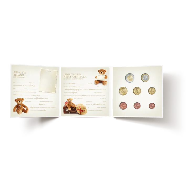 Containing all eight euro coins minted in proof quality, the set comes gift-packed in a charming booklet in which you and Peter the Bear can tell the personal story of your new family member. Children love hearing about the first steps they took, and this booklet is the perfect place in which to document that and other landmarks in your child’s development.
