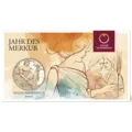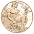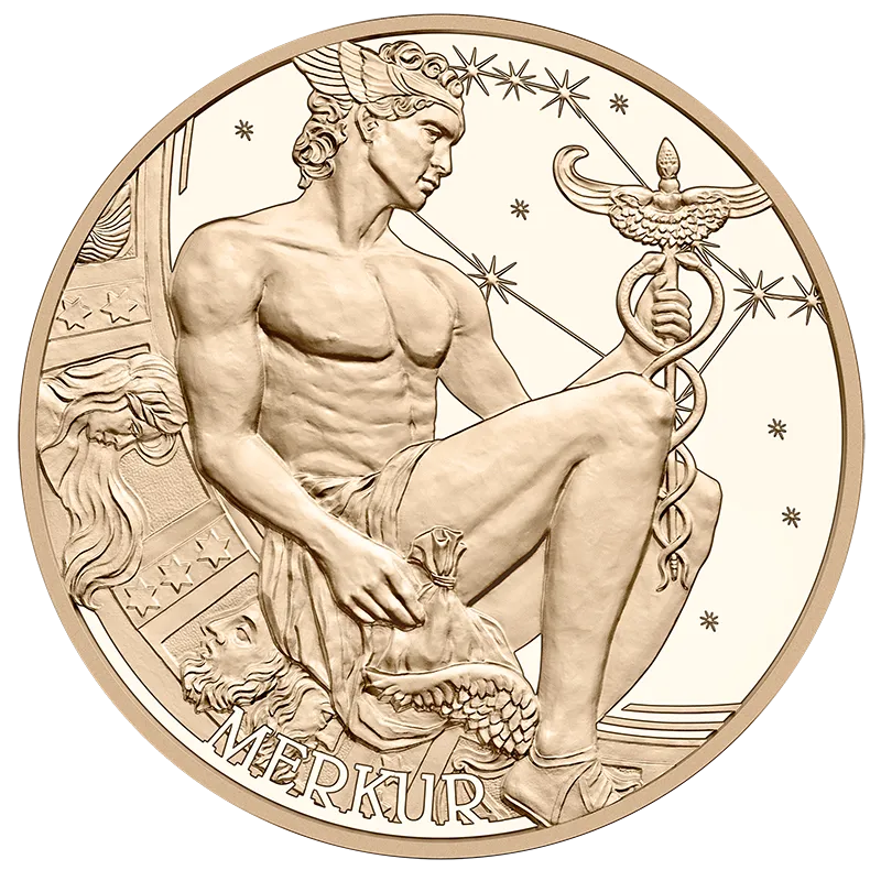 Sporting a winged helmet, the Roman god Mercury is seen lost in thought on the Calendar Medal 2026. In his right hand is a money bag, in his left hand is a caduceus, a winged wand around which two serpents are coiled. The caduceus transformed everything it touched into gold and abundance and was a symbol of peaceful and lawful trade. On its other side, the Calendar Medal 2026 features all the Sundays and public holidays in the year.
