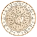 From an astrological perspective, Mercury rules the year 2026 and is associated with Gemini and Virgo. The constellation of Gemini can be seen behind Mercury and, at the bottom left edge of the medal, the zodiac signs Virgo and Gemini. On the other side is a depiction of Virgo around whom concentric circles list the dates of all the Sundays and public holidays in 2026.